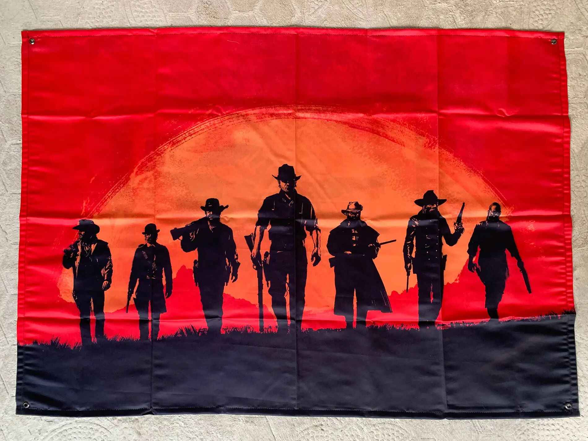 یک تصویر رازآلود و حماسی از Red Dead Redemption 2 که حس ماجراجویی و خطر را یکجا به نمایش میگذارد! طراحی با غروب خورشید سرخرنگ و چهرههای نامعلوم شخصیتهای بازی در پسزمینه، حالوهوایی سینمایی و پررمزوراز به این پرچم داده است.