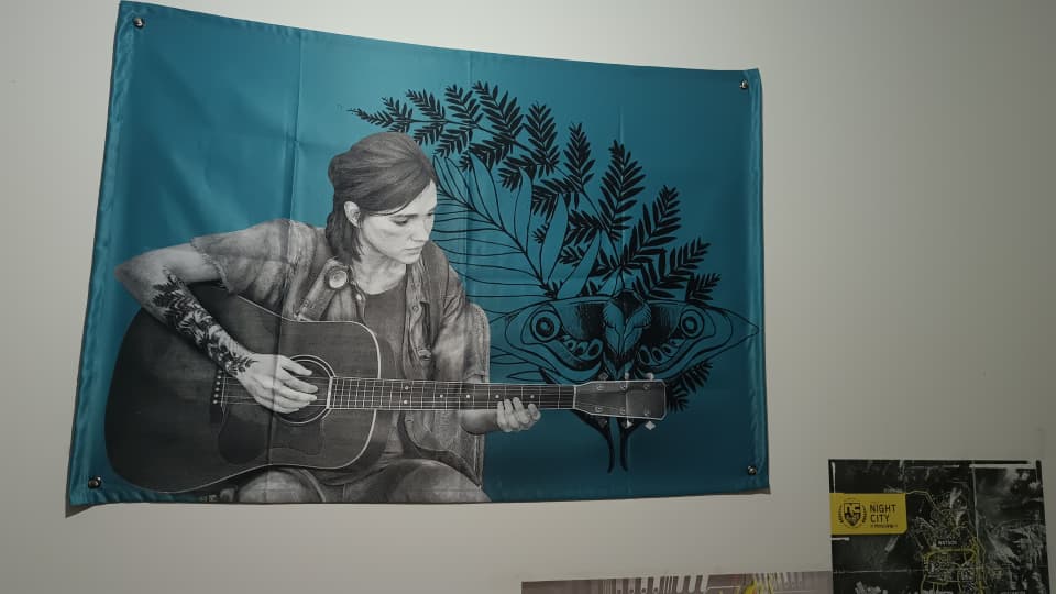 لحظهای احساسی و فراموشنشدنی از The Last of Us Part II را با این پرچم زیبا به دکور خود اضافه کنید! طراحی با جزئیات دقیق از الی در حال نواختن گیتار، در حالی که طرح تتوی معروفش به شکل هنری روی پسزمینه نمایش داده شده، ترکیبی از موسیقی، خاطره و هویت او را به تصویر میکشد.